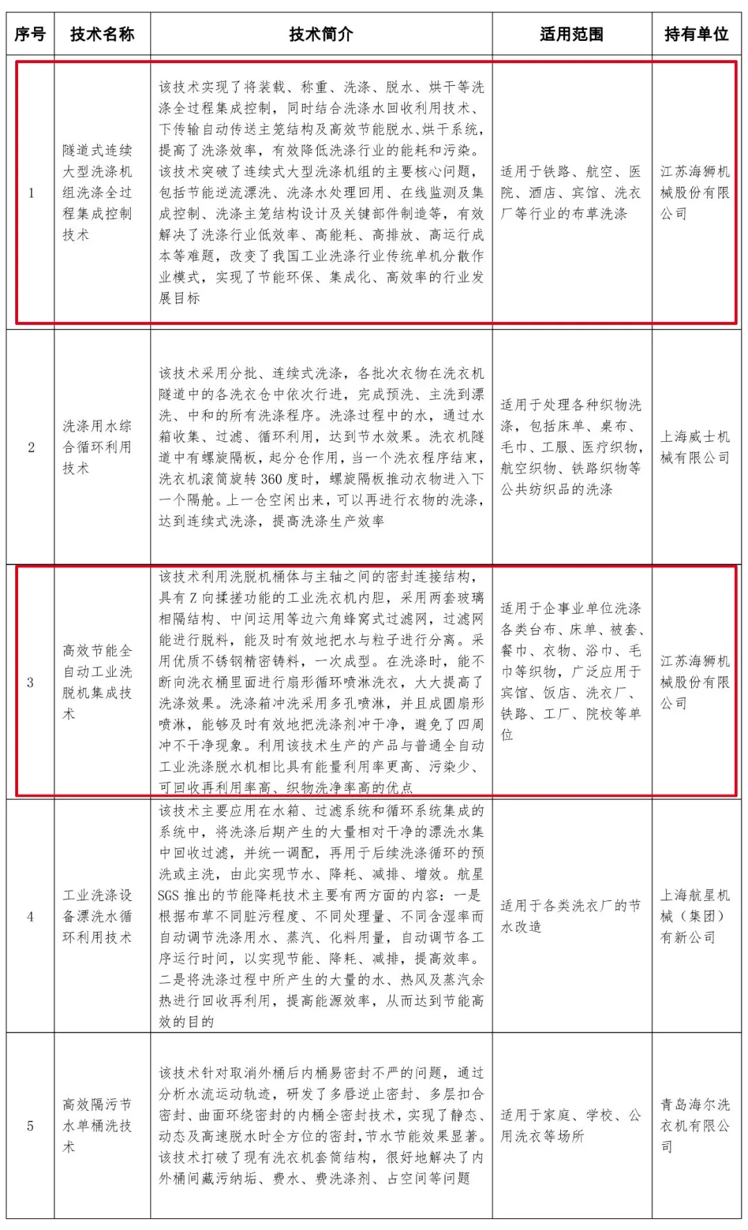 2020年11月16日,水利部、國家機(jī)關(guān)事務(wù)管理局關(guān)于公布國家成熟適用節(jié)水技術(shù)推廣目錄(2020年)的公告正式發(fā)布,為貫徹節(jié)水優(yōu)先方針,落實(shí)《國家節(jié)水行動方案》目標(biāo)任務(wù),強(qiáng)化節(jié)水科技創(chuàng)新引領(lǐng),促進(jìn)水資源節(jié)約集約利用,水利部、國家機(jī)關(guān)事務(wù)管理局共同征集了洗滌設(shè)備、衛(wèi)生潔具、中央空調(diào)等領(lǐng)域的節(jié)水技術(shù)。經(jīng)專家評審、網(wǎng)絡(luò)公示,最后洗滌設(shè)備領(lǐng)域有4家企業(yè)5項(xiàng)成熟技術(shù)被收錄到《國家成熟適用節(jié)水技術(shù)推廣目錄(2020年)》中。江蘇海獅機(jī)械股份有限公司的隧道式連續(xù)大型洗滌機(jī)組洗滌全過程集成控制技術(shù)和高效節(jié)能全自動工業(yè)洗脫機(jī)集成技術(shù)被收錄到國家成熟適用節(jié)水技術(shù)推廣目錄之中。